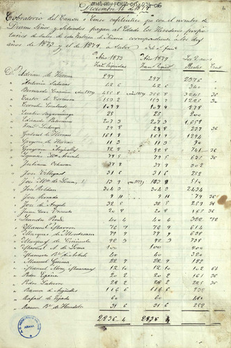 Lista cobratoria del repartimiento entre los miembros de la Comunidad de Herederos de las salinas de Añana para el pago del Diezmo Señor y Situado de los años 1873 y 1879