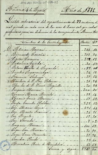 Lista cobratoria del repartimiento entre los miembros de la Comunidad de Herederos de las salinas de Añana para el pago del Diezmo Señor del año 1887