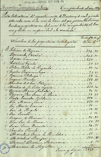 Lista cobratoria del repartimiento para gastos de junta entre los miembros de la Comunidad de Herederos...