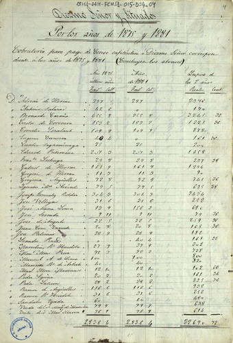 Lista cobratoria del repartimiento entre los miembros de la Comunidad de Herederos de las salinas de Añana para el pago del Diezmo Señor y Situado de los año 1875 y 1881