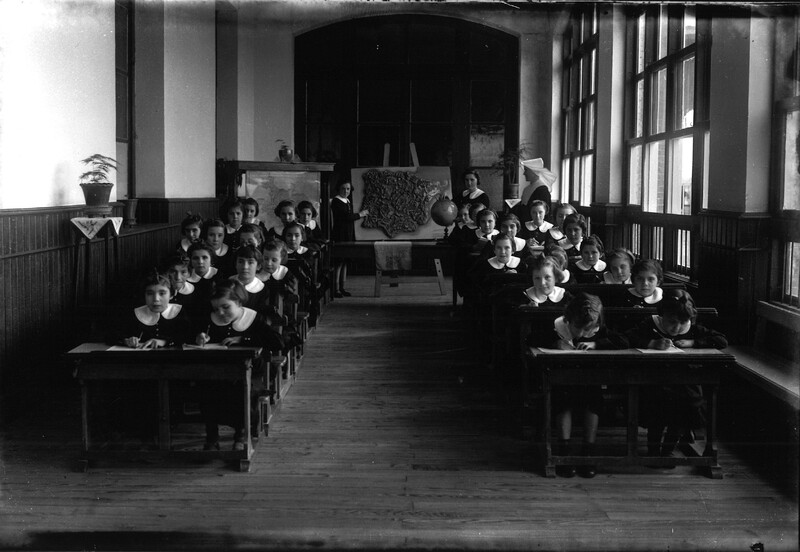 Aula del asilo de Nuestra Señora de las Nieves, donde las alumnas, uniformadas, estudian en pupitres, ordenados en dos filas. Al fondo, dos niñas de pie y una monja están junto a un mapa geográfico de la península ibérica y una bola del mundo