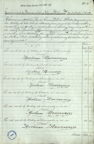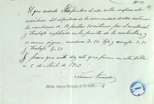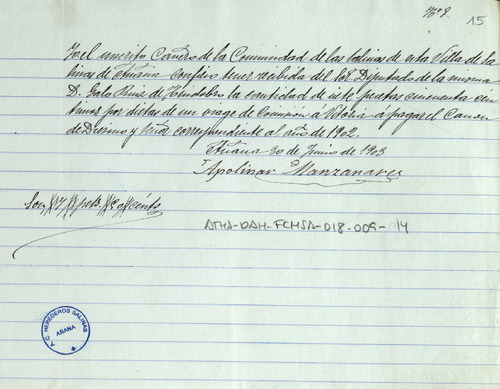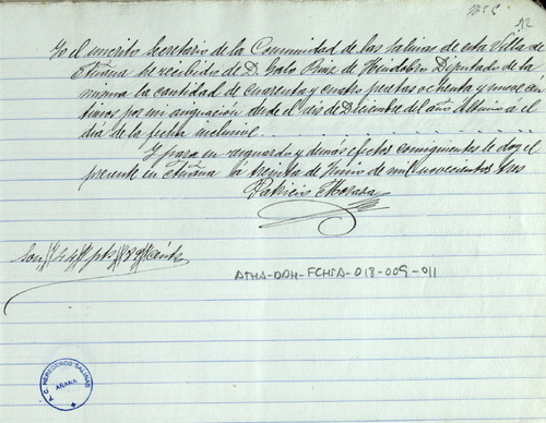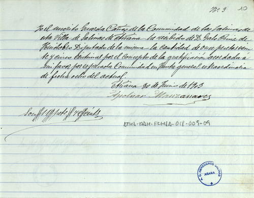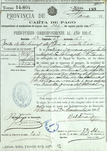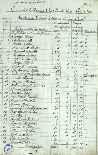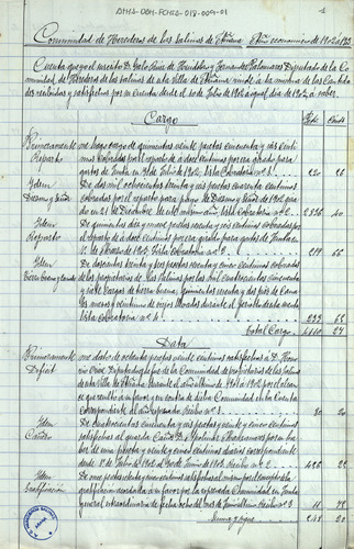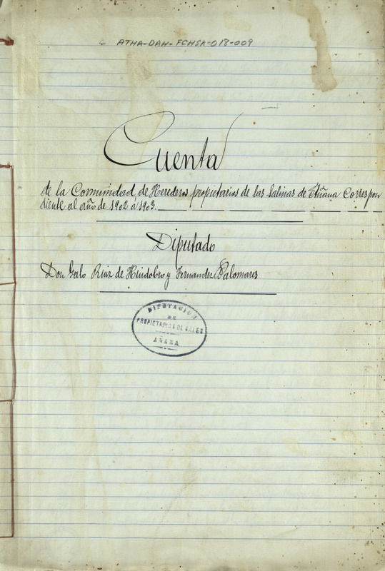 Cuentas de la Comunidad de Herederos de las salinas de Añana, correspondiente al año de 1902-03, junto con sus recibos comprobatorios y listas cobratorias de los repartimientos entre los Herederos, para el pago del censo de Salmantón, Diezmo y Señor, gastos de la Junta y las cargas de tierra buena y pies de canal que cada uno de ellos ha llevado para sus granjas
