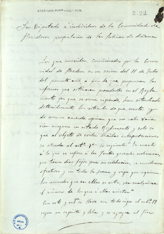 Informe de Ramón de Argüelles, Gregorio de Herrán y Ramón Ruiz de Huidobro, comisionados por la Comunidad de Herederos de las salinas de Añana para tratar sobre la reforma del reglamento para la buena administración y gobierno de la misma, manifestando que no cabe ninguna variación en el citado reglamento salvo alguna modificación en los artículos 7º y 19º, más una agregación final de un artículo adicional