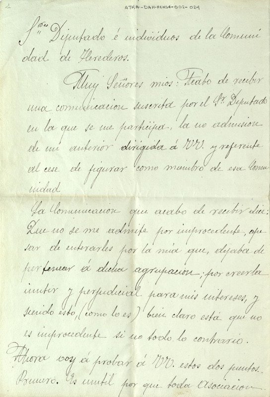 Carta de Ubaldo Cruzado dirigida al Diputado e individuos de la Comunidad de Herederos de las salinas de Añana, sobre el cese de figurar como miembro de la dicha Comunidad por considerarla inútil y perjudicial para sus intereses