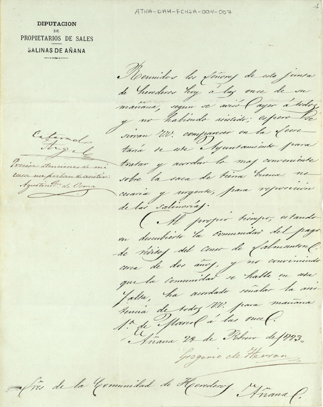 Convocatoria a Junta de la Comunidad de Herederos de las salinas de Añana para el día 1 de marzo de 1883, para tratar sobre la saca de tierra buena para la reposición de las salinerías y sobre el descubierto en los pagos del rédito del censo de Salmantón