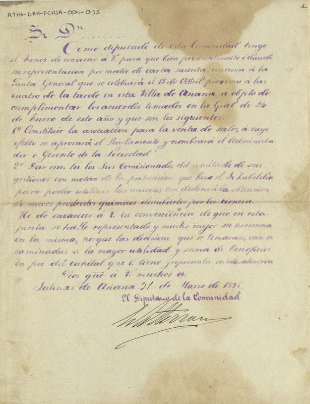 Convocatoria a Junta General de la Comunidad de Herederos de las salinas de Añana para el día 15 de abril de 1895, para constituir la asociación para la venta de sales y para dar cuenta de las gestiones realizadas en cuanto a la proposición del señor Zubeldia, para utilizar las mueras con destino a la obtención de nuevos productos químicos descubiertos
