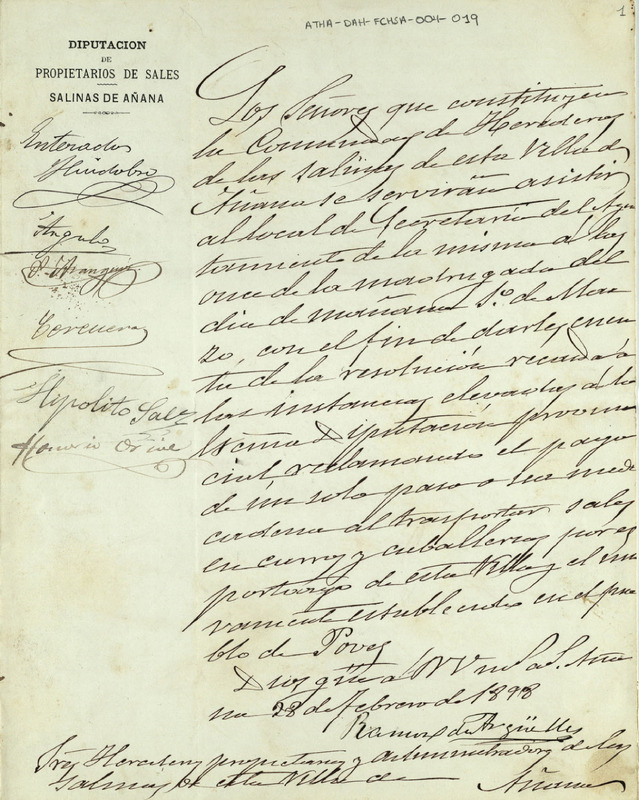 Convocatoria a Junta de la Comunidad de Herederos de las salinas de Añana para el día 1 de marzo de 1898, para dar cuenta de una resolución de la Diputación Provincial de Álava, sobre el pago de portazgos en los transportes de sales