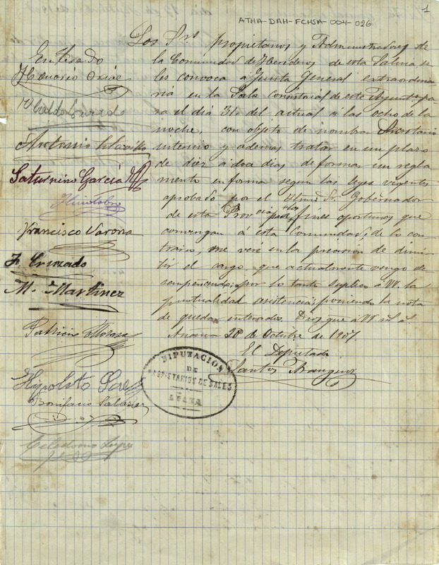 Componentes especiales del documento: 1.- Sello "Diputación de Propietarios de sales de Añana":\nSello ovalado de tinta negra. 4,5 x 3,5 cms. Sello de solo lectura. DIPUTACIÓN DE PROPIETARIOS DE SALES. AÑANA