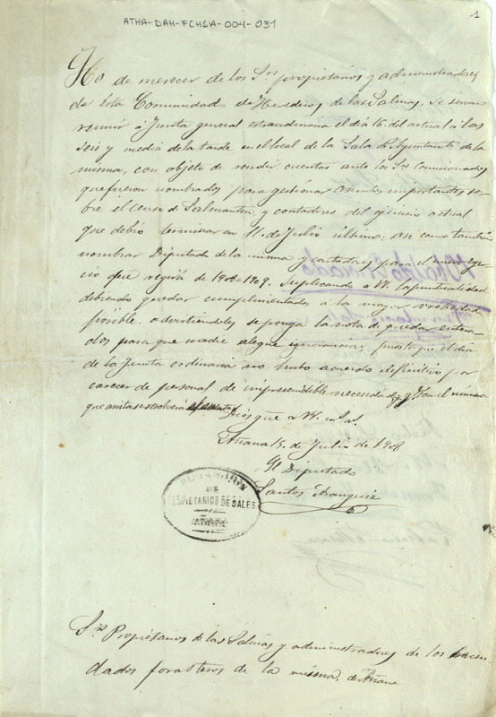 Componentes especiales del documento: 1.- Sello "Diputación de Propietarios de sales de Añana":\nSello ovalado de tinta negra. 4,5 x 3,5 cms. Sello de solo lectura. DIPUTACIÓN DE PROPIETARIOS DE SALES. AÑANA