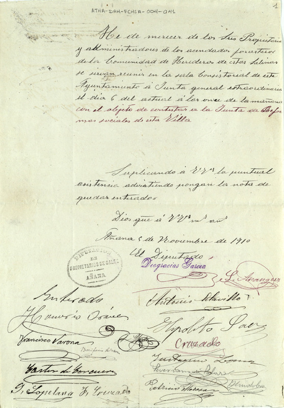 Convocatoria a Junta General extraordinaria de la Comunidad de Herederos de las salinas de Añana para el día 6 de noviembre de 1910, con el objeto de contestar a la Junta de Reformas sociales de Salinas de Añana