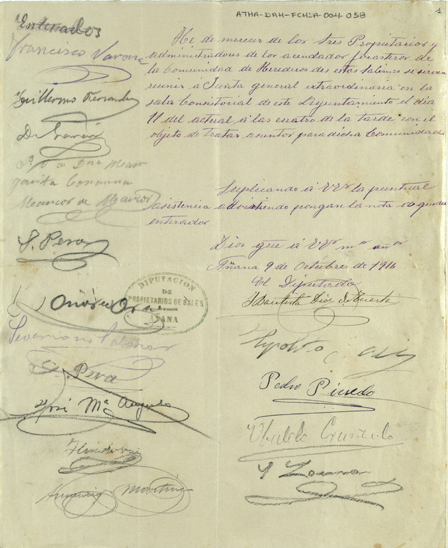 Componentes especiales del documento: 1.- Sello "Diputación de Propietarios de sales de Añana":\nSello ovalado de tinta verde. 4,5 x 3,5 cms. Sello de solo lectura. DIPUTACIÓN DE PROPIETARIOS DE SALES. AÑANA