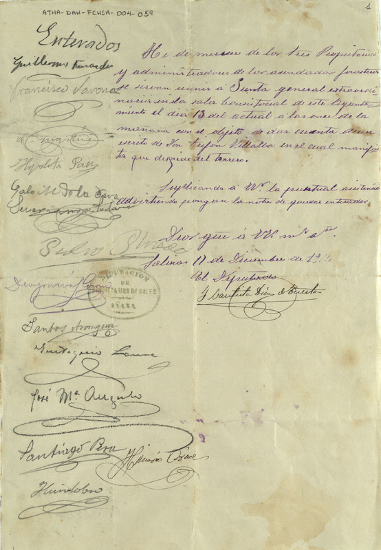 Componentes especiales del documento: 1.- Sello "Diputación de Propietarios de sales de Añana":\nSello ovalado de tinta verde. 4,5 x 3,5 cms. Sello de solo lectura. DIPUTACIÓN DE PROPIETARIOS DE SALES. AÑANA