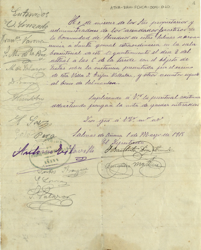 Convocatoria a Junta General extraordinaria de la Comunidad de Herederos de las salinas de Añana para el día 2 de mayo de 1915, con objeto de dar cuenta de una instancia presentada por Trifón Villalba y otros asuntos respecto al censo de Salmantón
