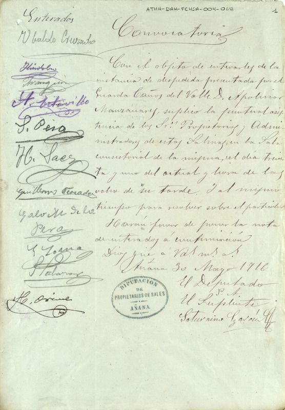 Convocatoria a Junta de la Comunidad de Herederos de las salinas de Añana para el día 31 de mayo de 1916, con motivo de dar cuenta de la instancia de despedida presentada por Apolinar Manzanares, Guarda de caños del Valle Salado
