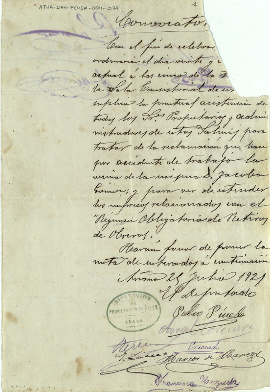 Convocatoria a Junta de la Comunidad de Herederos de las salinas de Añana para el día 26, 27, 28 o 29 de julio de 1921, para tratar sobre la reclamación por accidente de trabajo de la vecina de Salinas de Añana, Jacoba Gómez