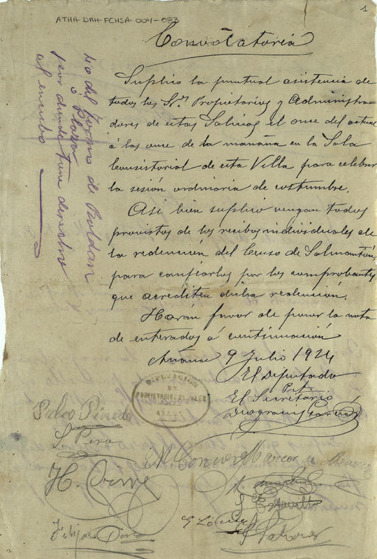Convocatoria a Junta de la Comunidad de Herederos de las salinas de Añana para el día 11 de julio de 1924, para confiar los recibos del censo de Salmantón que acreditan la redención del mismo