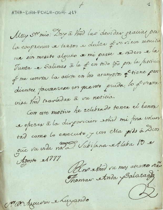 Carta de Tomás de Anda y Salazar dirigida a Agustín de Luyando, agradeciéndole el envío de tarros de dulce y comunicándole tener el honor de ofrecer a la disposición de su merced, su propia voluntad