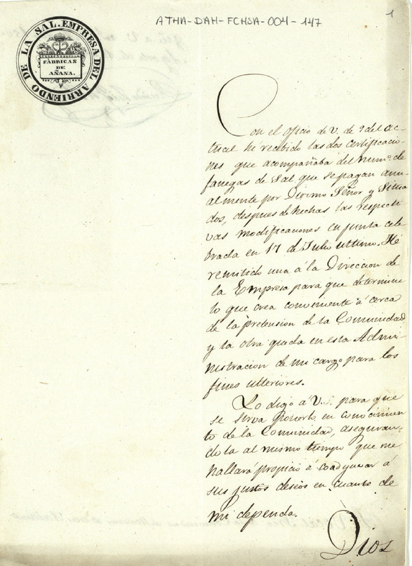 Oficio de Ricardo Joaquín Henry como administrador de la fábrica de sal de Añana, dirigido al vocal secretario de la Comunidad de Herederos de las salinas de Añana, comunicando haber recibido la expresión de fanegas de sal que pagaban los Herederos anualmente, en concepto de Diezmo Señor y Situado, noticiando haberlo remitido a la dirección de la Empresa, para que determine lo que crea conveniente