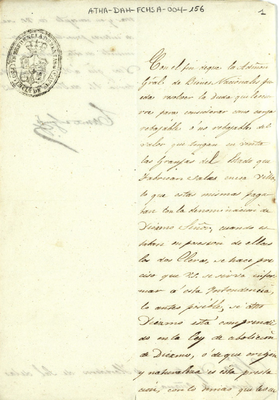 Oficio de la Intendencia de Rentas de la Provincia de Álava, dirigido a la Diputación de Herederos de Sal delas fábricas de Añana, pidiendo información, con el fin de que se pueda resolver la deuda que le ocurre para considerar como carga rebajable o no rebajable del valor que tengan en venta las granjas del Estado que fabrican sales en esa villa, lo que se pagaba por el denominado diezmo señor y si dicho diezmo está comprendido en la Ley abolitoria de diezmos