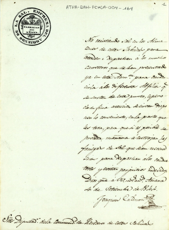 Oficio de Joaquín Calderón, administrador de las fábricas de salinas de Añana, dirigido a los Diputados de la Comunidad de Herederos de las mismas, pidiendo la realización de un nuevo entroje de sal por la falta de ésta en los alfolíes