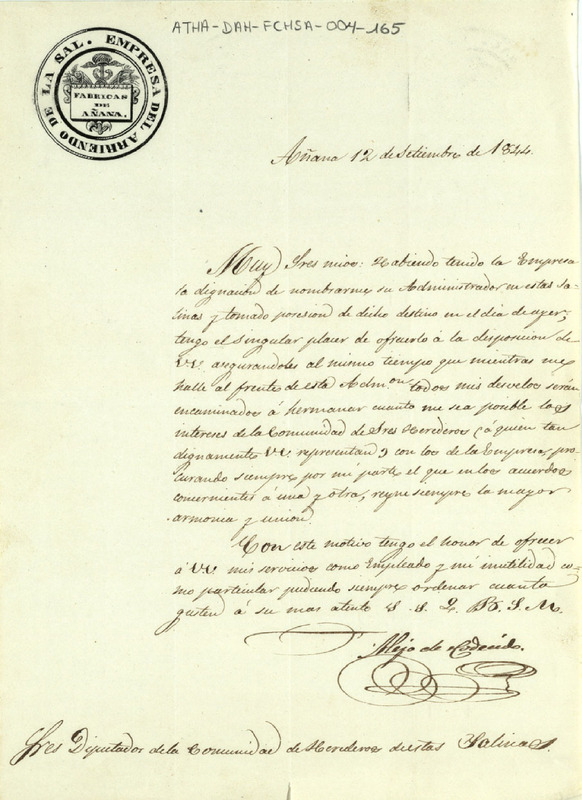 Oficio de Alejo de Codecido notificando al Diputado de la Comunidad de Herederos de las salinas de Añana, el nombramiento de su cargo de Administrador de la expresada salina por parte de la Empresa del Arriendo de la Sal
