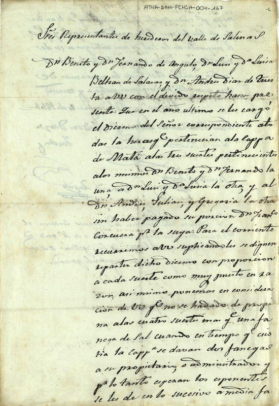 Instancia presentada por varios interesados a los representantes de Herederos del valle de Salinas, pidiendo repartir la carga del Diezmo Señor de manera equitativa a sus suertes