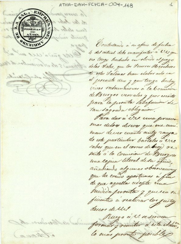 Oficio de Alejo Codecido, administrador de las fábricas de salinas de Añana, dirigido a los Diputados de la Comunidad de Herederos de las mismas, comunicando que había realizado vivas reclamaciones a la Comisión de Burgos, vervales y por escrito, para el cobro de sales elaboradas por la dicha Comunidad en el presente año