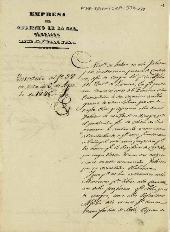 Componentes especiales del documento: 1.- Membrete: "Empresa del Arriendo de la Sal, Fábricas de Añana"\nMembrete de solo lectura: EMPRESA DEL ARRIENDO DE LA SAL. FÁBRICAS DE AÑANA