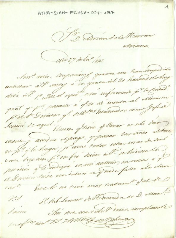 Carta de Francisco Martín Valiente dirigida a Andrián de Herrán, comunicando que el expediente estaba informado por la Contaduría General y para pasarse a que se dé cuenta al Ministro por el Director General de Rentas Estancas