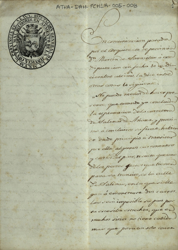 Oficio del Diputado General de Álava Benito María de Vivanco dirigido al Ayuntamiento de Salinas de Añana, animándole a realizar las obras propuestas por el Arquitecto de Provincia, para la buena terminación y seguridad de la carretera que se dirigía a dicha villa, trasladando para ello el informe del expresado Arquitecto