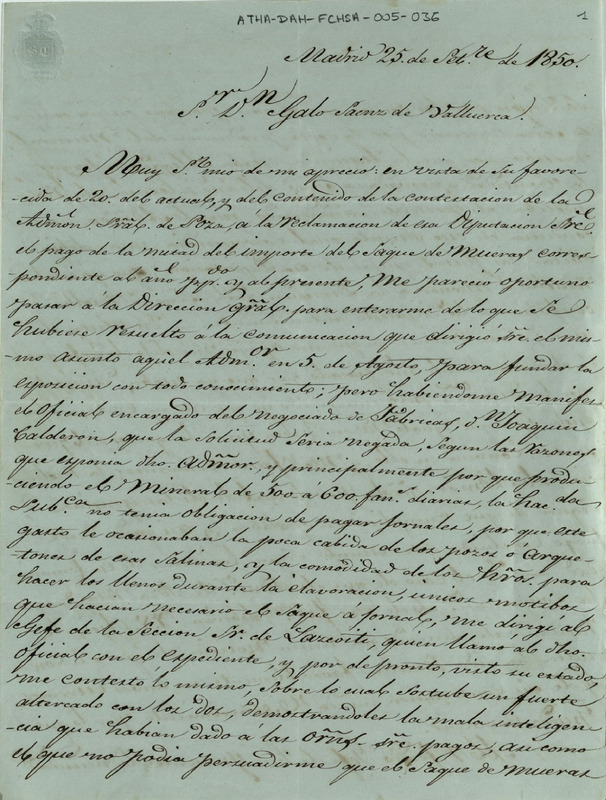 Carta de Santiago María Ruiz de Cela, comisionado de la Comunidad de Herederos de las salinas de Añana, dirigida a Galo Sáenz de Valluerca, comunicándole las gestiones que había realizado para el cobro de la mitad de los gastos de la extracción de la muera