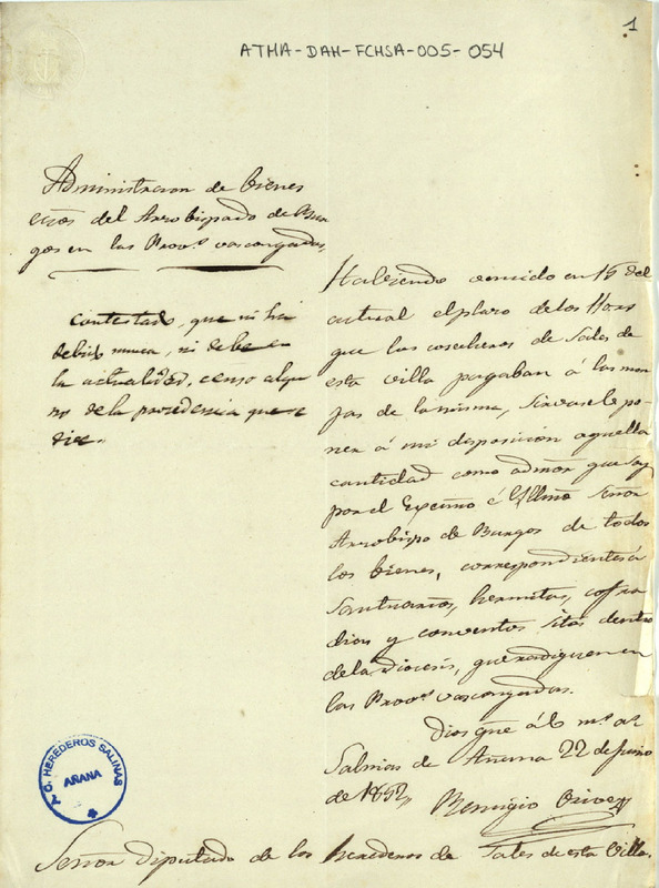 Oficio de Remigio de Orive de la Administración de bienes del Arzobispado de Burgos dirigido al Diputado de la Comunidad de Herederos de las salinas de Añana, reclamado el pago de 110 reales de un censo que debía dicha Comunidad a las monjas de la citada localidad