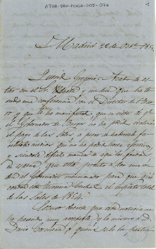 Carta de Galo de Tejada a Gregorio de Herrán, haciéndole saber que el Ministro de Hacienda había ordenado que se girara contra la Tesorería Central el importe total de las sales de 1854