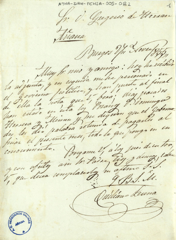 Oficio de Quiliano Lerena a Gregorio de Herrán, haciéndole saber que el Gobernador de Burgos había dado su palabra de pagar las sales del año 1854, al finalizar el presente mes