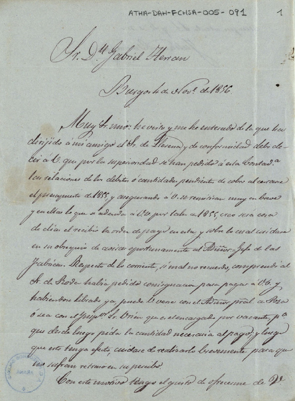 Carta de Julián Barrueta a Gabriel de Herrán, haciéndole saber que era cuestión de días que se recibiera la orden de pagar lo que se adeudaba a la Comunidad de Herederos de las salinas de Añana, por las sales de 1855