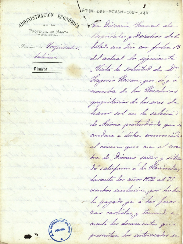 Oficio de la Administración Económica de la Provincia de Álava dirigido al Diputado de la Comunidad de Herederos de las salinas de Añana, desestimando su pretensión de que se condonara a dicha Comunidad el pago del diezmo señor y situado de los años 1872 a 1875, ya que lo había pagado a las fuerzas carlistas