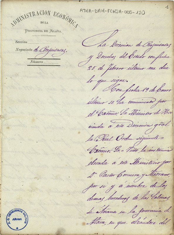 Oficio de la Administración Económica de la provincia de Álava dirigido al Diputado de la Comunidad de Herederos de las salinas de Añana, Cástor Corcuera y Medrano, desestimando la pretensión de esta última, de que se le condonara el pago del Diezmo Señor y Situado de los años 1872 a 1875, por haberlo pagado ya a las fuerzas carlistas
