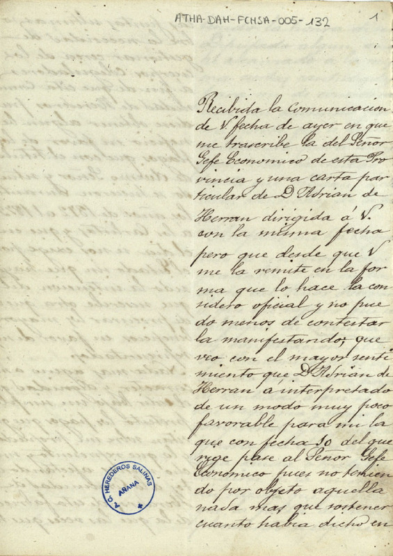 Carta de Ramón de Argüelles dirigida al Diputado de la Comunidad de Herederos de las salinas de Añana, comunicándole su disgusto por el trato que se le había dado en una carta Adrián de Herrán