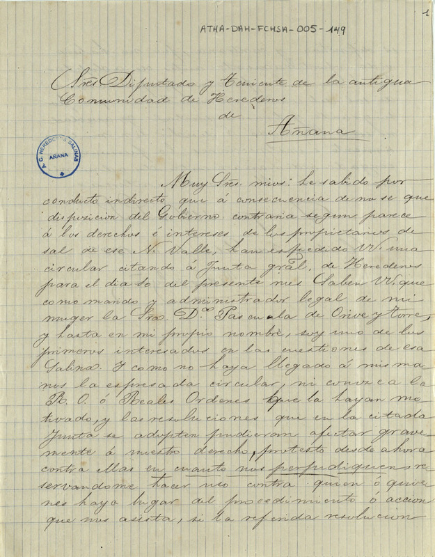 Carta de Pedro de Egaña dirigida al Diputado y Teniente de la Comunidad de Herederos de las salinas de Añana, protestando por no haber recibido la circular que convocaba a la Junta General de dicha Comunidad y oponiéndose a todo lo que se pudiera acordar en ella