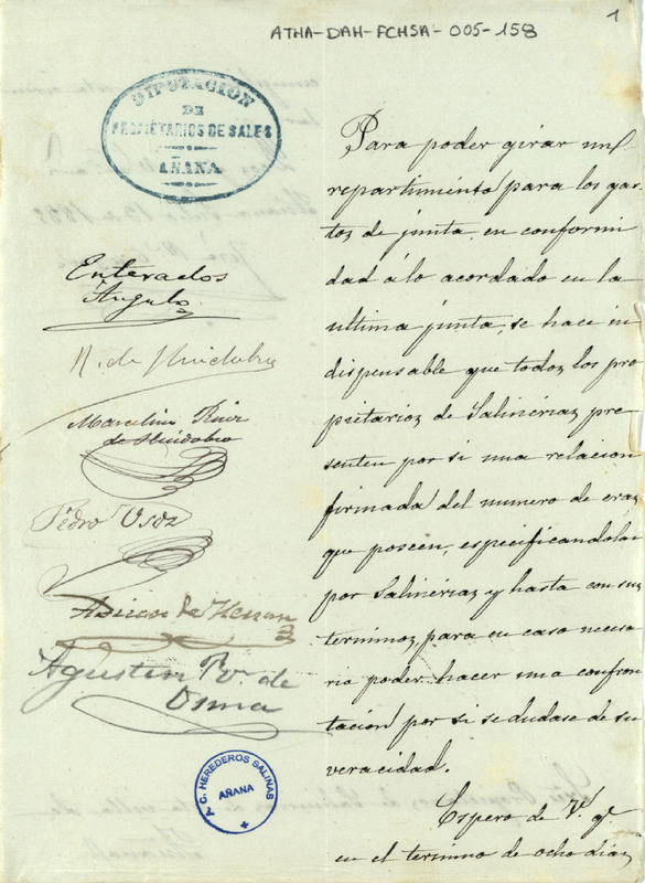 Circular de José María Cruzado, Diputado de la Comunidad de Propietarios de sales de Añana, solicitando la presentación, por parte de los propietarios de salinerías de la villa de Salinas de Añana, de una relación del número de eras que poseían para poder girar el repartimiento correpondiente