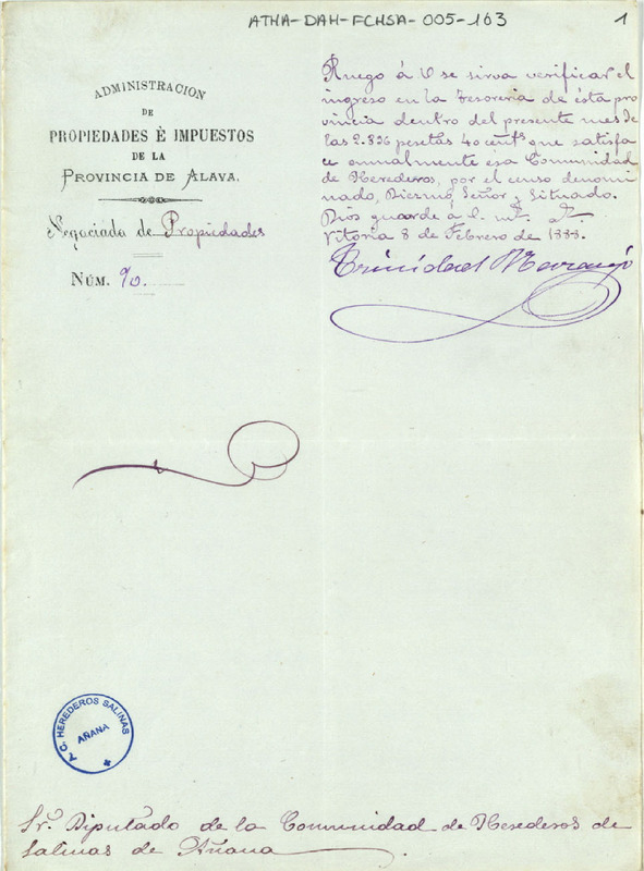 Oficio de la Administración de Propiedades e Impuestos de la provincia de Álava, dirigido al Diputado de la Comunidad de Herederos de las salinas de Añana, comunicándole que debían hacer efectivo el pago de 2.836,40 pesetas por el canon de Diezmo Señor y Situado