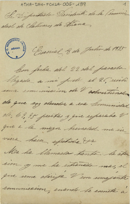 Carta de Juan José de Herrán dirigida al Diputado de la Comunidad de Herederos de las salinas de Añana, negándose a satisfacer las 69,95 pesetas que le reclamaba