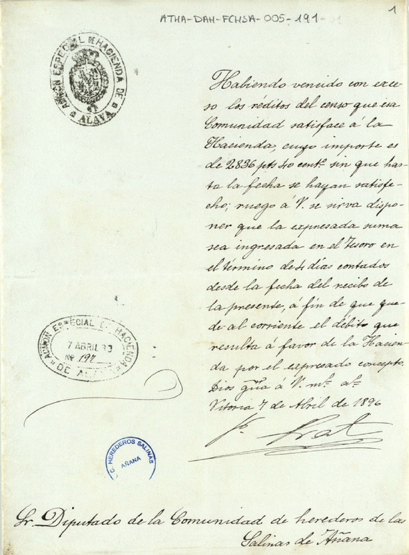 Oficio de Francisco Prat de la Administración Especial de Hacienda de Álava dirigido a la Comunidad de Herederos de las salinas de Añana, urgiéndoles al pago de 2.836,40 pesetas en el plazo de cuatro días, por los réditos del censo que tenían suscrito con la misma