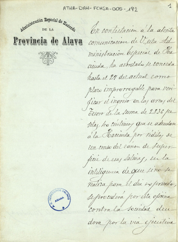 Oficio de Francisco Prat de la Administración Especial de Hacienda de Álava dirigido a la Comunidad de Herederos de las salinas de Añana, en contestación a una anterior del Diputado de dicha Comunidad, concediéndole la prórroga solicitada para el pago de 2.836,40 pesetas correspondientes a réditos del censo del canon de superficie
