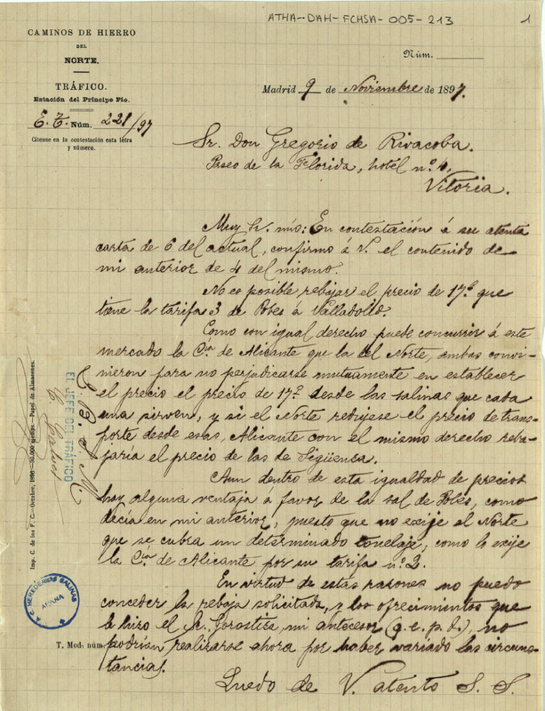 Comunicación del Jefe del Tráfico de los Caminos de Hierro del Norte, dirigida a Gregorio de Rivacoba haciéndole, saber que no podía concederse una rebaja de la tarifa para el trasnporte de la sal de de Salinas de Añana, desde Pobes a Valladolid