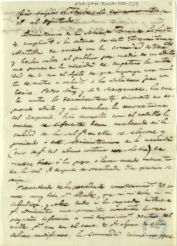 Copia simple del oficio de Felipe de Urquijo, Administrador de las salinas de Añana, dirigido al alcalde de dicha villa, solicitando que se impusiera una multa a los salineros Francisco Gerica, Pedro Martínez y María Manzanares, por remover con rodillo la muera de diferentes eras, a pesar de estar terminantemente prohibido