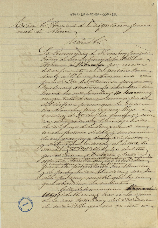 Borrador de un oficio de la Comunidad de Herederos de las salinas de Añana dirigido a la Diputación Provincial de Álava, solicitando una rebaja en la cuota que debían abonar por Diezmo Señor y Situado