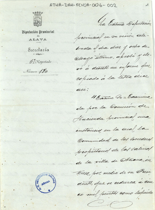 Oficio de la Diputación Provincial de Álava dirigido a Comunidad de Herederos de las salinas de Añana, trasladándole un informe de la Comisión de Hacienda Provincial, sobre la contribución a la propiedad en Añana