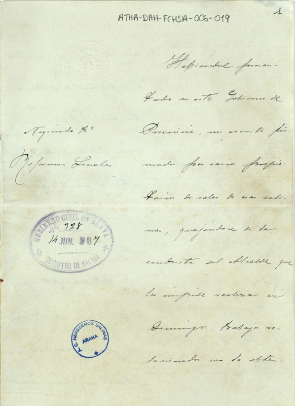 Oficio del Gobierno Civil de Álava dirigido a la Comunidad de Propietarios de Sales de Salinas de Añana, solicitándo un informe acerca de las razones por las que el alcalde de dicha villa, no les permitía realizar en domingo ningún trabajo relacionado con la obtención de sal