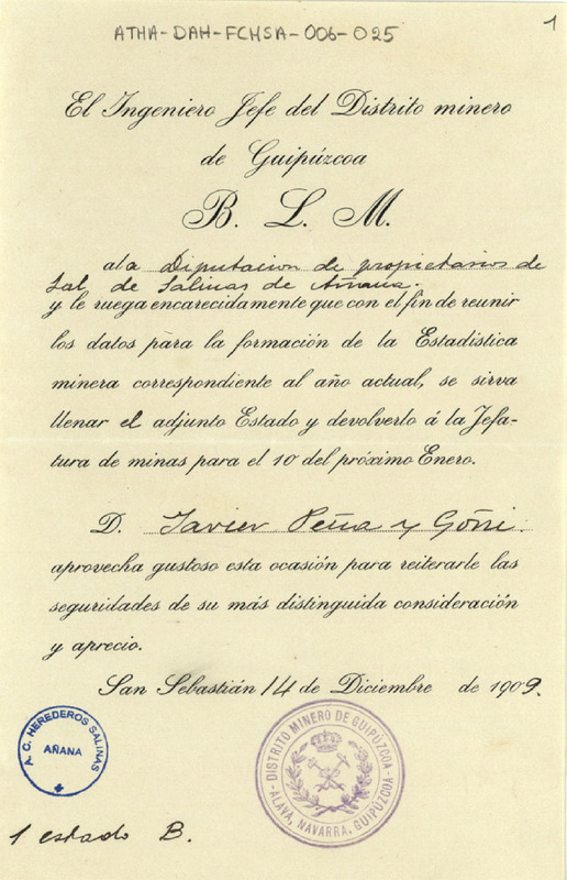 Oficio de, Javier Peña Goñi, Ingeniero Jefe del Distrito minero de Guipúzcoa, dirigido a la Diputación de Propietarios de sales de las salinas de Añana, solicitando que facilitara la estadística minera correspondiente a 1909